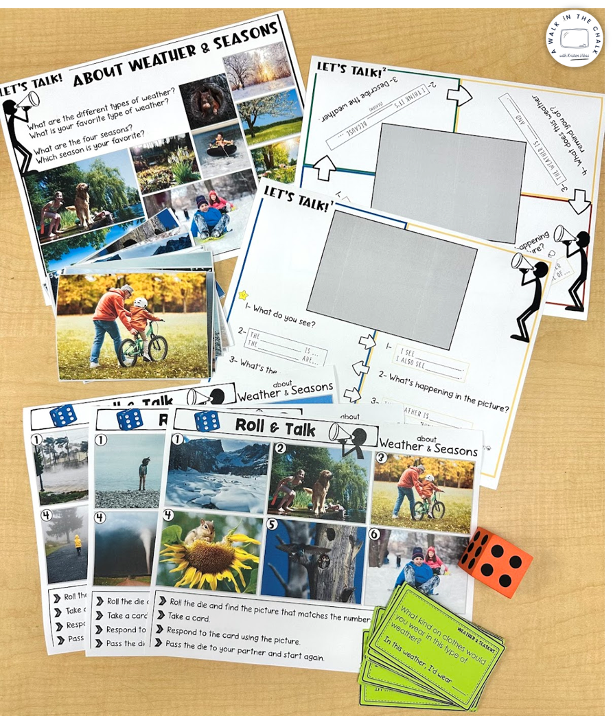 If you’d like to see examples of Speaking Mats, or try them with your own students, I’ve linked resources below. Each set includes a background building poster, differentiated speaking mats, and fun Roll n’ Talk mats.