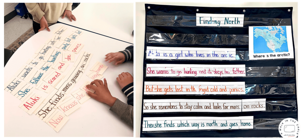 I write the sentences out, have students read them and put them in order. Next, I cut the sentences apart and have students put them back together (sentence structure) and read the sentences again. Students are physically manipulating the parts of the story, which helps them: